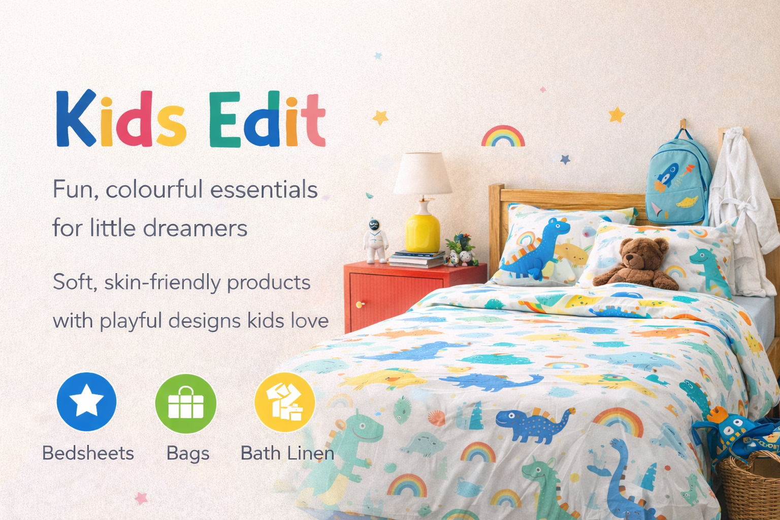 Our kids range includes playful bedsheets, bags, bathrobes, and towels designed with soft, skin-friendly fabrics and cheerful prints kids love.