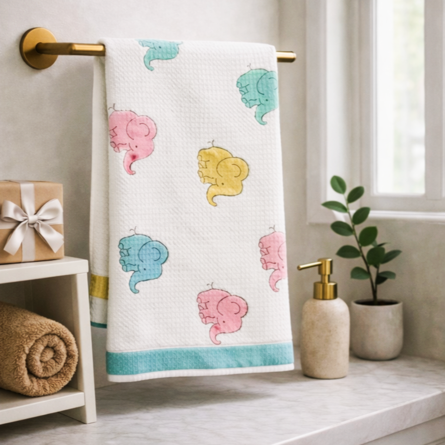Say goodbye to bath time battles! Our Kids Bath Towels brings playful energy with its cheerful handblock prints and kid-approved colour palette. The soft waffle texture feels wonderful against young skin while the fun designs turn drying off into playtime. Durable enough to handle splashes and spins, this towel is a must-have for every child's bathroom. Make bath time the highlight of their day!